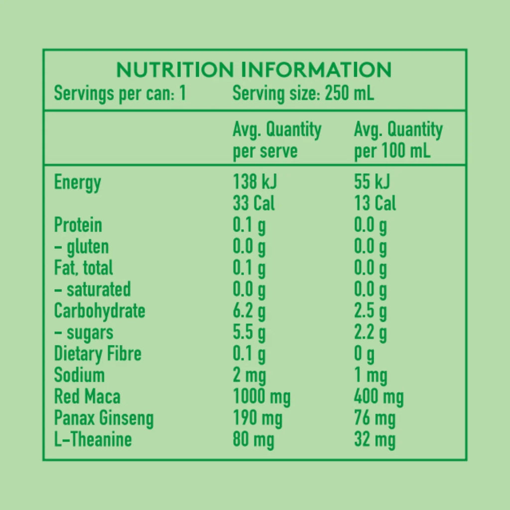 Purified Sparkling Water, NZ Apple Juice Concentrate, Hawkes Bay Lime Juice, Natural Sweetener (Fermented Glucose (Erythritol)), Elta Ego™ Bioactive Botanical Blend (Red Maca Extract, Panax Ginseng Extract, L-Theanine), Natural Flavours, Natural Acidity Regulator (Citric Acid), Natural Thickener (Acacia Gum).