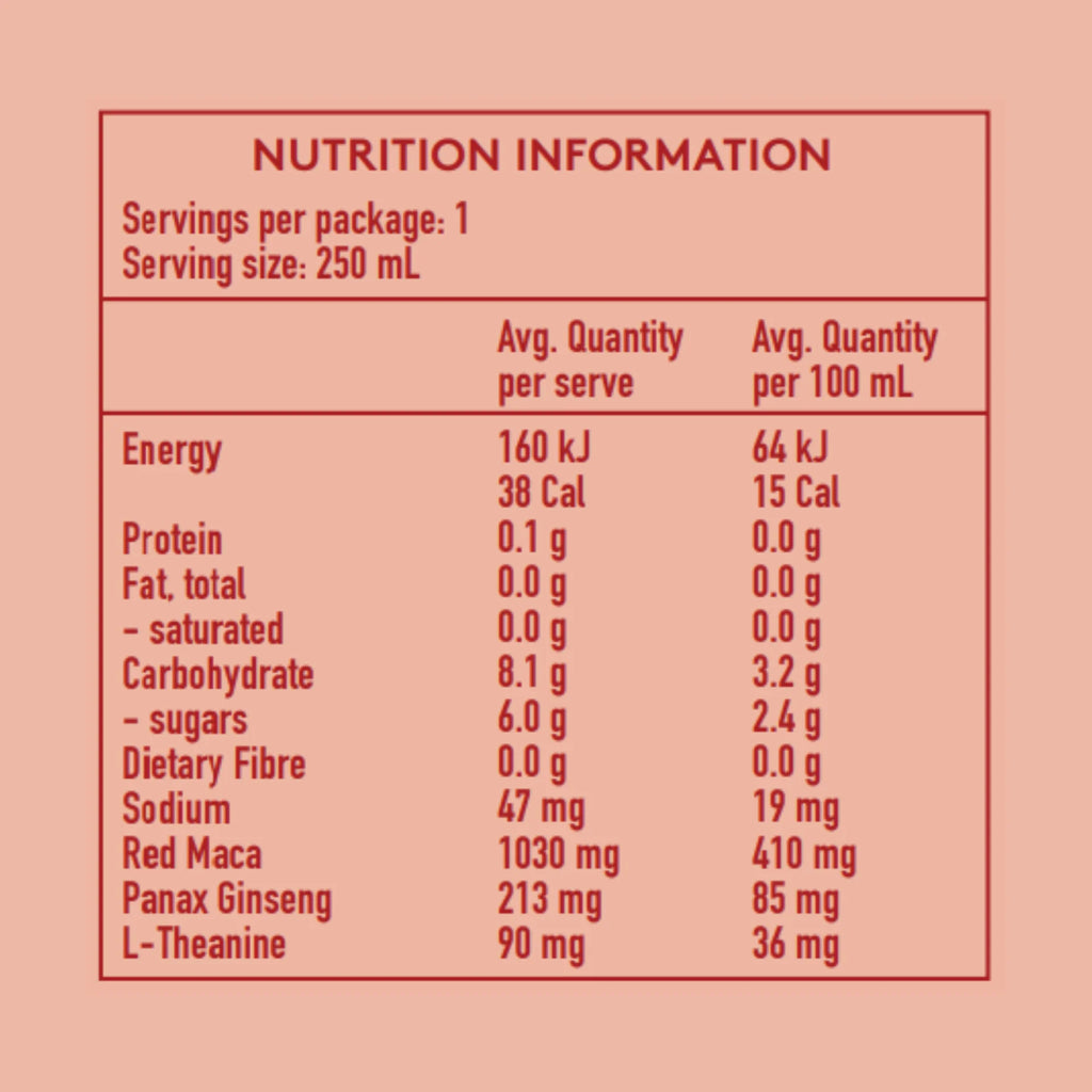 Sparkling Water, Apple Juice Concentrate, Natural Flavours (Orange Bitters, Vermouth, Gin), Elta Ego™ Adaptogen Blend (Red Maca Extract, Panax Ginseng Extract, L-Theanine), Acidity Regulators (Citric Acid, Sodium Citrate), Natural Sweetener (Monk Fruit Juice Concentrate), Natural Colour (Burnt Sugar, Black Carrot Juice Concentrate), Natural Thickener (Acacia Gum).