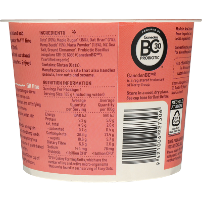 - Oats* (70%), Maple sugar* (15%), Oat bran* (7%), Hemp seeds* (5%), Maca powder* (1.5%), NZ Sea Salt, Ground cinnamon*, Probiotic Bacillus coagulans GBI-30 6086 (GanedenBC30®). (*certified organic)