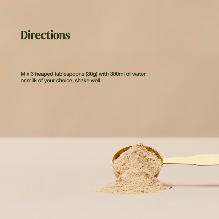 Organic Fermented Blend (Sprouted & Fermented Pea Protein*, Spirulina*, Millet*, Quinoa*, Spinach*, Alfalfa Grass*, Sweet Potato*, Pumpkin Seeds*, Sunflower Seeds*, Linseeds*, Chia Seeds*, Molasses*#), Cocoa Powder*, Natural Flavours, Acacia Fibre*, Stevia Leaf Extract*, Digestive Enzyme (Bromelain). *Certified Organic #added for fermentation process (0.02%)