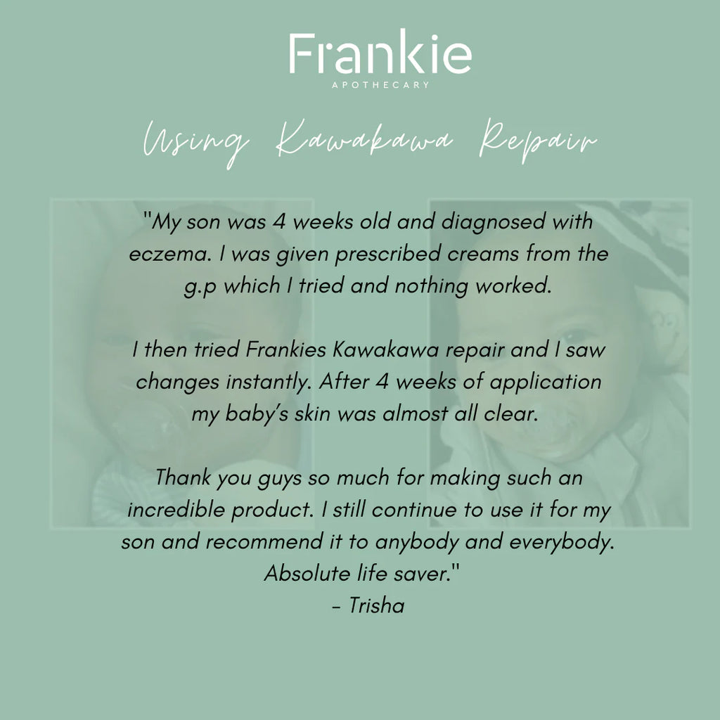 Our Award-Winning Frankie Kawakawa Balm is a totally natural product designed to support dry, itchy, eczema-prone skin. It contains no water, and you can be sure that your Kawakawa Balm is free from irritating preservatives, toxins and stabilisers used in water-based or synthetic formulations.